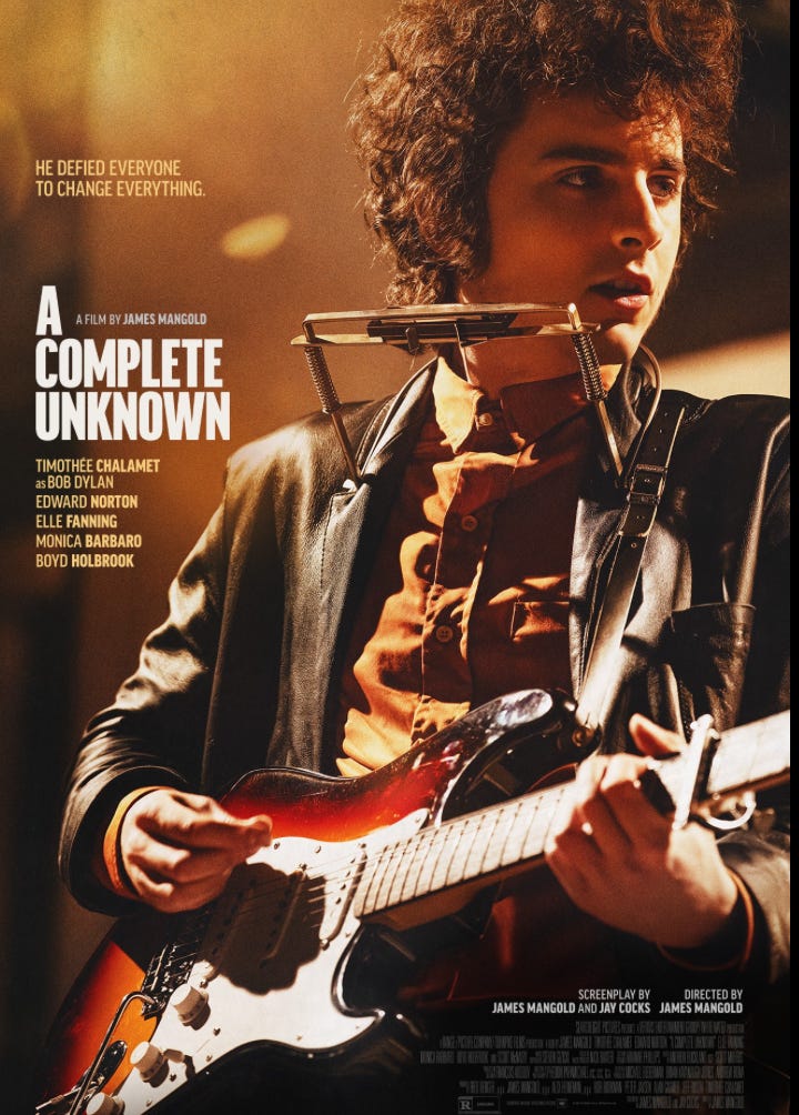 I knew that I had to go to A Complete Unknown — the biopic of Bob Dylan’s early years, so loosely based on a book about Dylan “going electric” that the author of that book is like Homer Simpson, Smiling Politely — hopefully he got a nice holiday out of it at the least, …