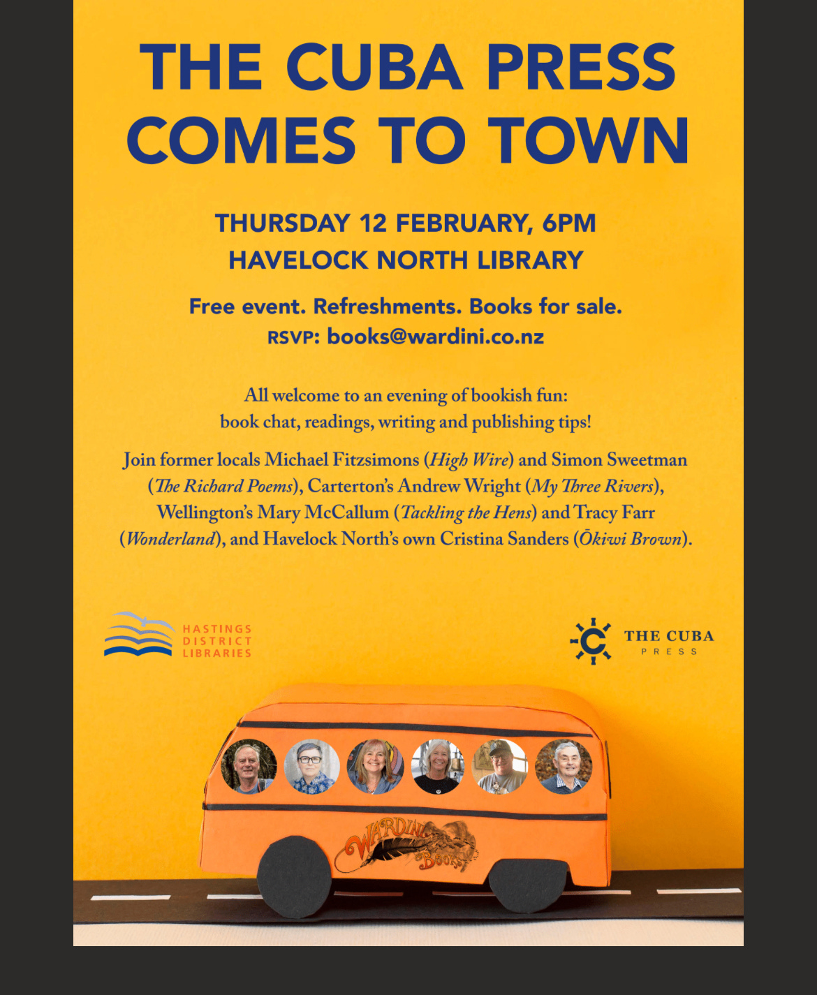 Get On The Bus! Wellington Writers Visit Havelock North: Thursday, Feb 12, 2026, 6pm — The Cuba Press Comes To Town