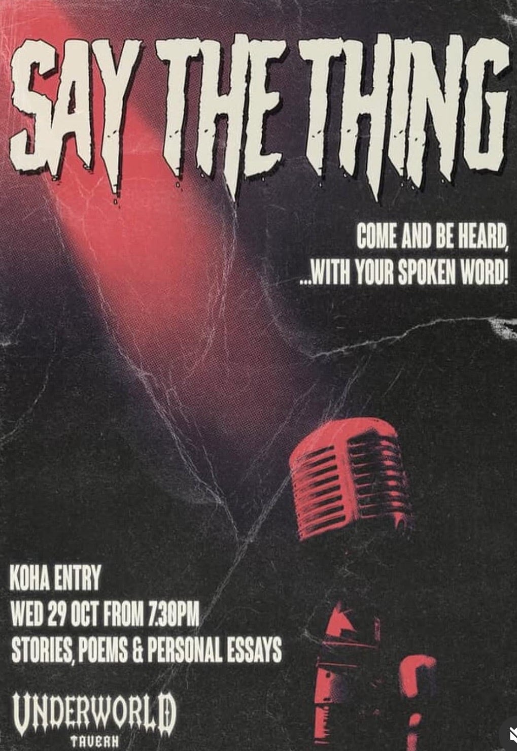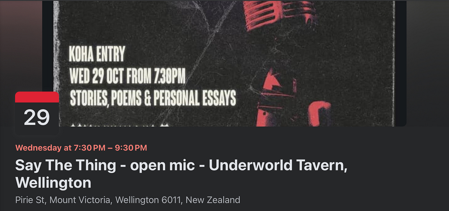 There’s a Facebook event if that’s your thing. But the details are all there. We appreciate a Koha on the night. We look forward to having you in the audience, or up on the stage — or both.