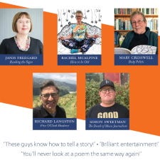These poets are Janis Freegard (Reading The Signs), Rachel McAlpine (How To Be Old), Mary Cresswell (Bo…